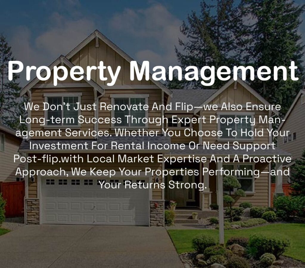 we don’t just renovate and flip—We also ensure long-term success through expert property management services. Whether you choose to hold your investment for rental income or need support post-flip.With local market expertise and a proactive approach, we keep your properties performing—and your returns strong.